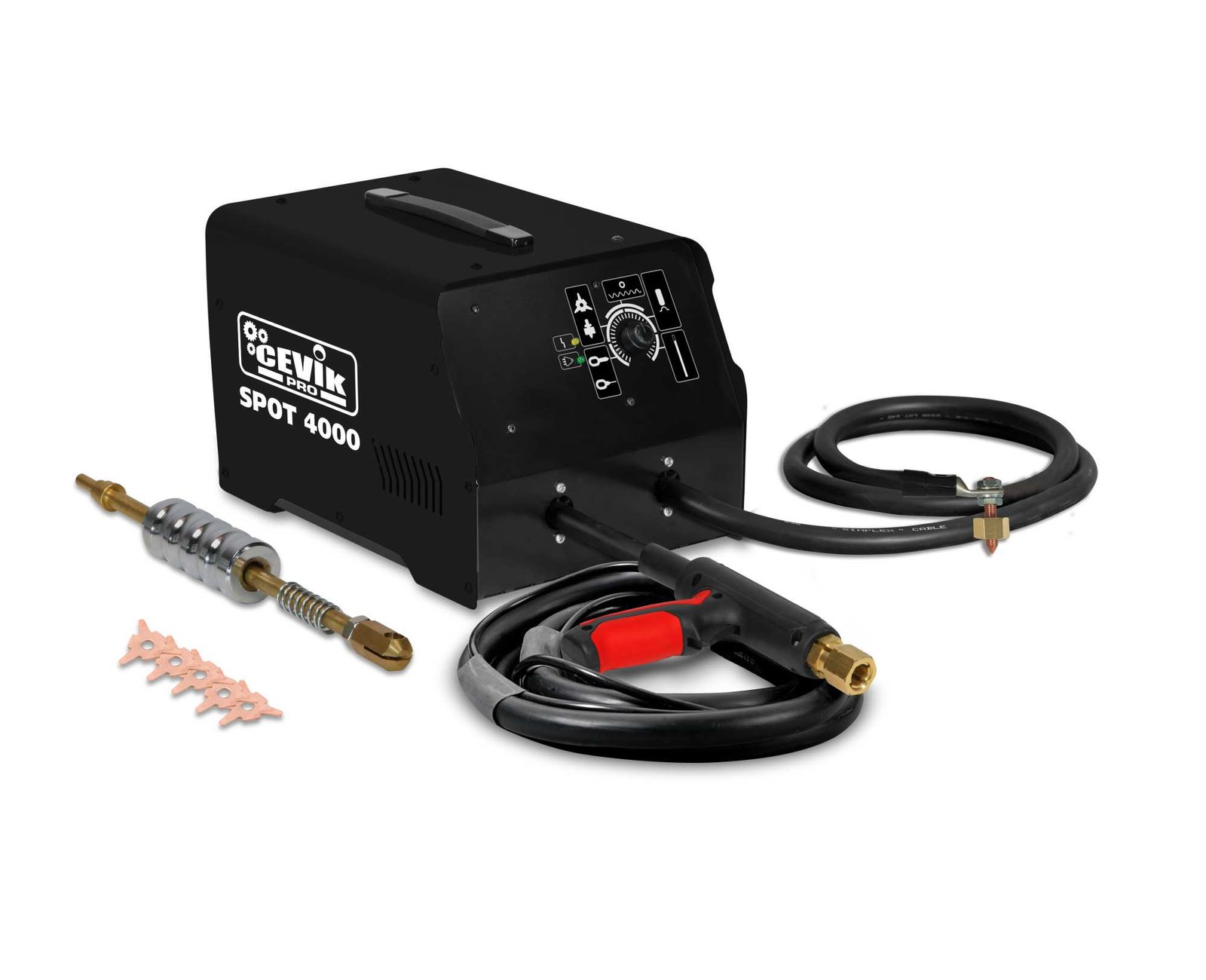 La Spot4000 230V est equipada con una pistola manual, un cable de masa con su respectiva masa para punteado, un extractor, un mandril y estrellas para traccin, lo que la convierte en una solucin integral para la reparacin de chapas de acero.